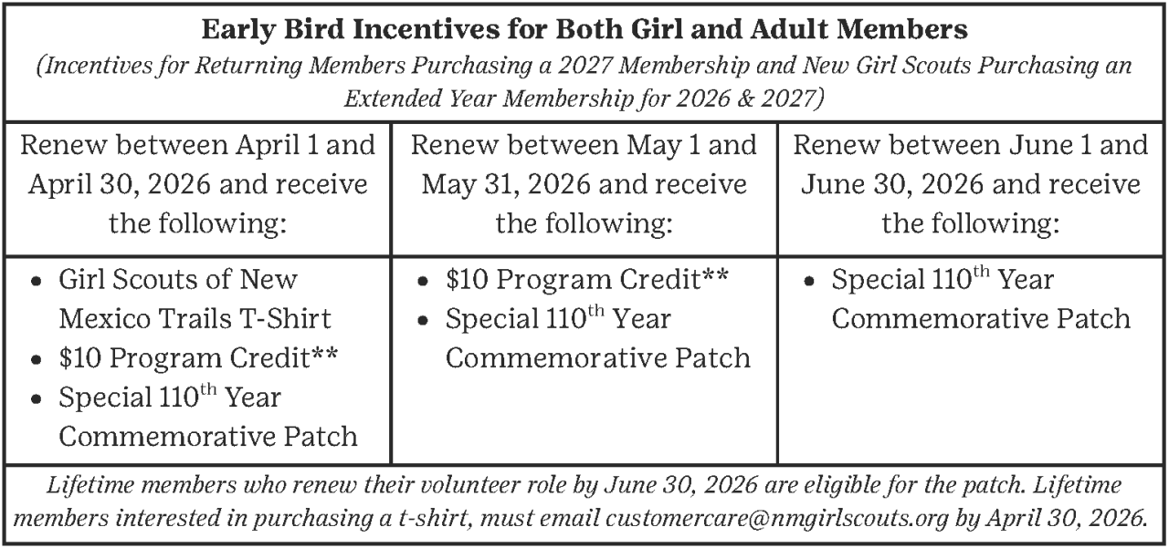 For 109 years, Girl Scouts in New Mexico have followed the Girl Scout motto: Be Prepared. So be prepared for the 110th year and renew your Girl Scout membership for the next year!