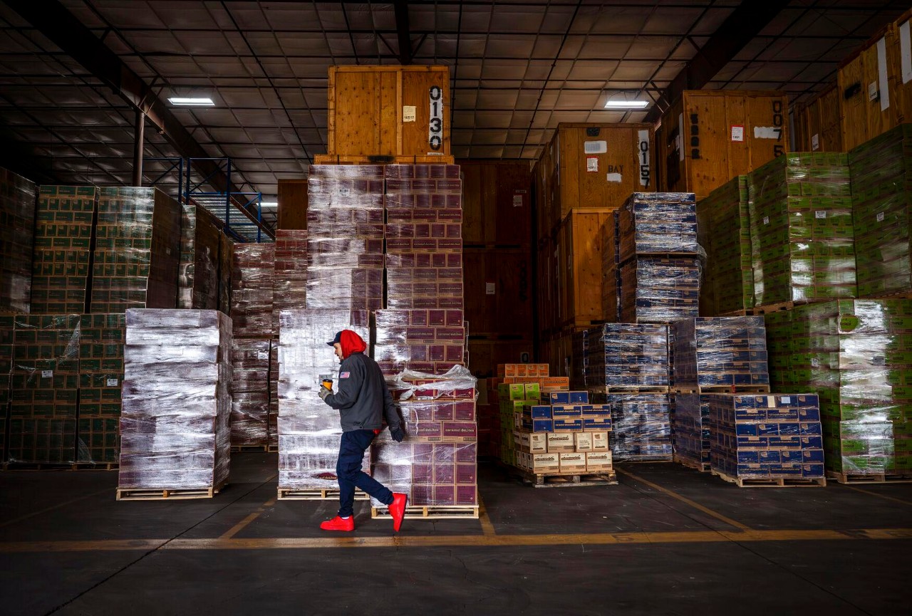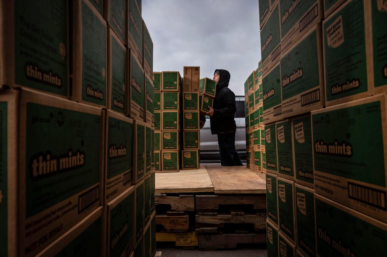 Caleb Sullivan, with Buehler Moving, walks past cases of Girl Scout cookies at Buehler Moving of Albuquerque’s warehouse in SE Albuquerque, N.M., on Thursday, Feb. 8, 2024. Troop leaders, parents, and volunteers lined up their vehicles and trailers as Buehler Moving employees packed them full of Girl Scout cookies for the annual cookie sales. A total of 351,804 packages of cookies are being distributed this week to Girl Scout Troops across two-thirds of the state.