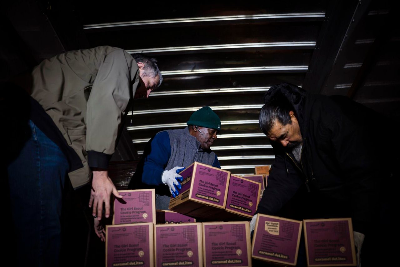 From the left, Marc Leasure, Otis Henry, and Angel Espinoza help load 14,000 Girl Scout cookie boxes for Troop 218 into a moving truck at Buehler Moving of Albuquerque’s warehouse in SE Albuquerque, N.M., on Thursday, Feb. 8, 2024. Troop leaders, parents and volunteers lined up their vehicles and trailers as Buehler Moving employees packed them full of Girl Scout cookies for the annual cookie sales. A total of 351,804 packages of cookies are being distributed this week to Girl Scout Troops across two-thirds of the state.