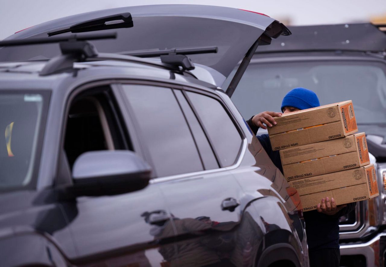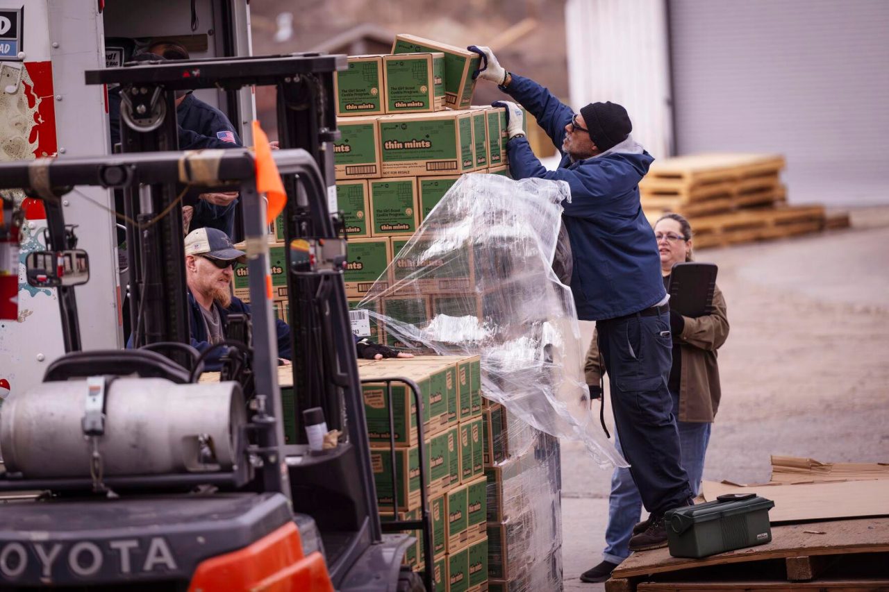 Travis Hix, with Buehler Moving, loads Thin Mints® Girl Scout cookies into vehicles at Buehler Moving of Albuquerque’s warehouse in SE Albuquerque, N.M., on Thursday, Feb. 8, 2024. Troop leaders, parents and volunteers lined up their vehicles and trailers as Buehler Moving employees packed them full of Girl Scout cookies for the annual fundraising event. A total of 351,804 packages of cookies are being distributed this week to Girl Scout troops across two-thirds of the state.