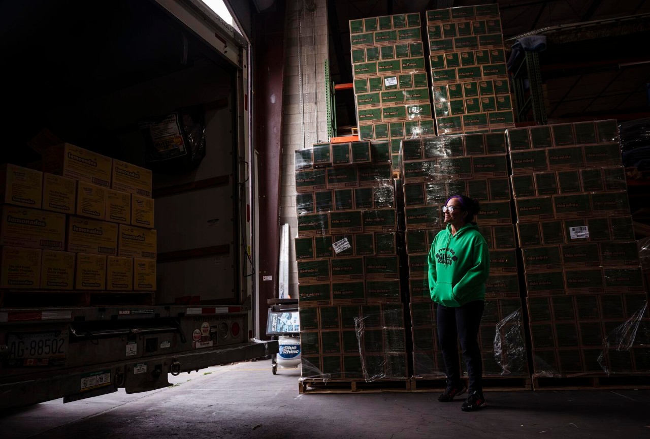 Sam Pike, Girl Scout troop leader 218, watches as 14,000 boxes of cookies are loaded into their moving truck at Buehler Moving of Albuquerque’s warehouse in SE Albuquerque, N.M., on Thursday, Feb. 8, 2024. Troop leaders, parents, and volunteers lined up their vehicles and trailers as Buehler Moving employees packed them full of Girl Scout cookies for the annual cookie sales. A total of 351,804 packages of cookies are being distributed this week to Girl Scout Troops across two-thirds of the state.