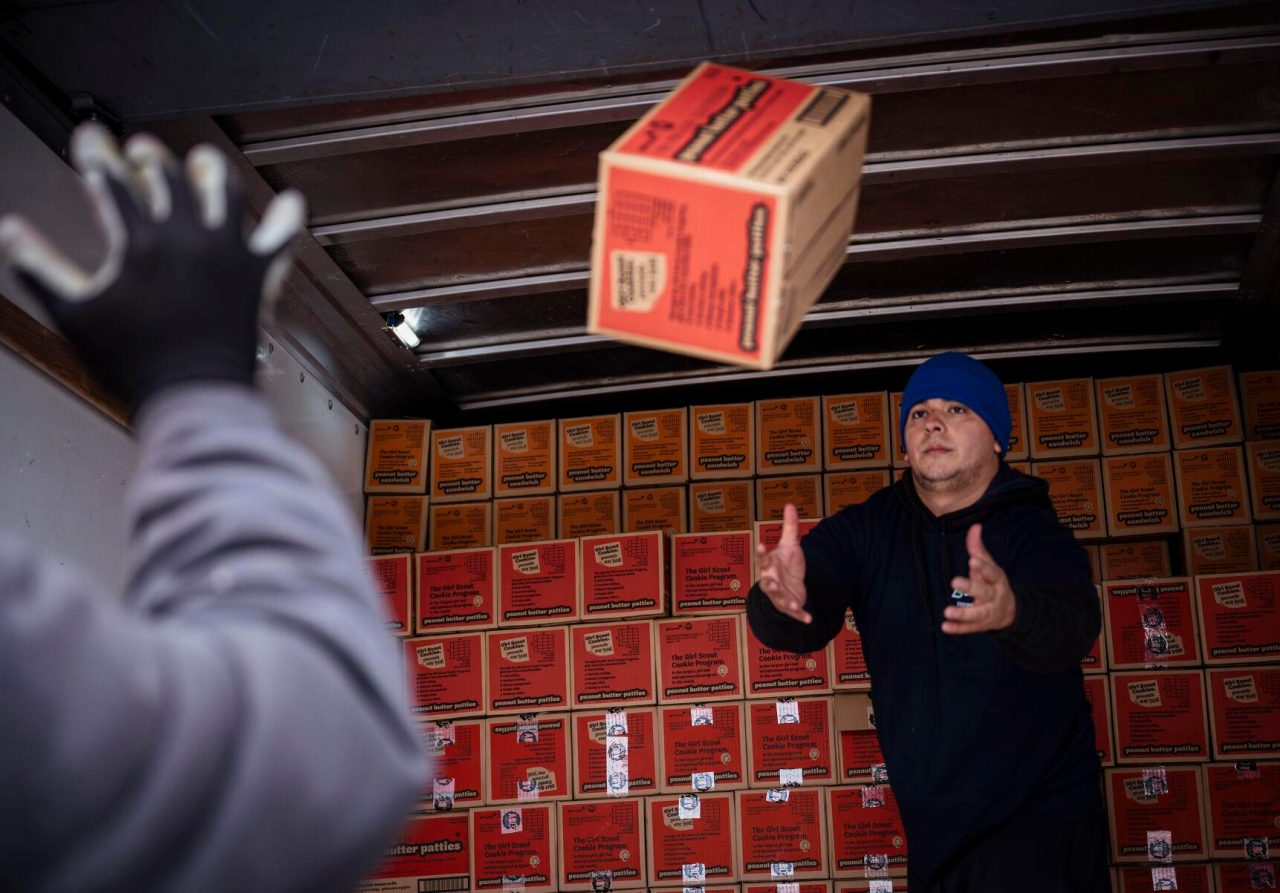 Saul Velazquez, with Buehler Moving, catches boxes of Girl Scout cookies, while loading them into a moving trailer